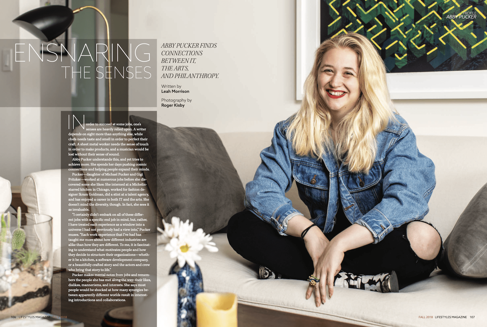 Abby Pucker Abby Pucker finds connections between IT, the arts, and philanthropy. Click on the image to read more Leah Morrison Author at Lifestyles Magazine