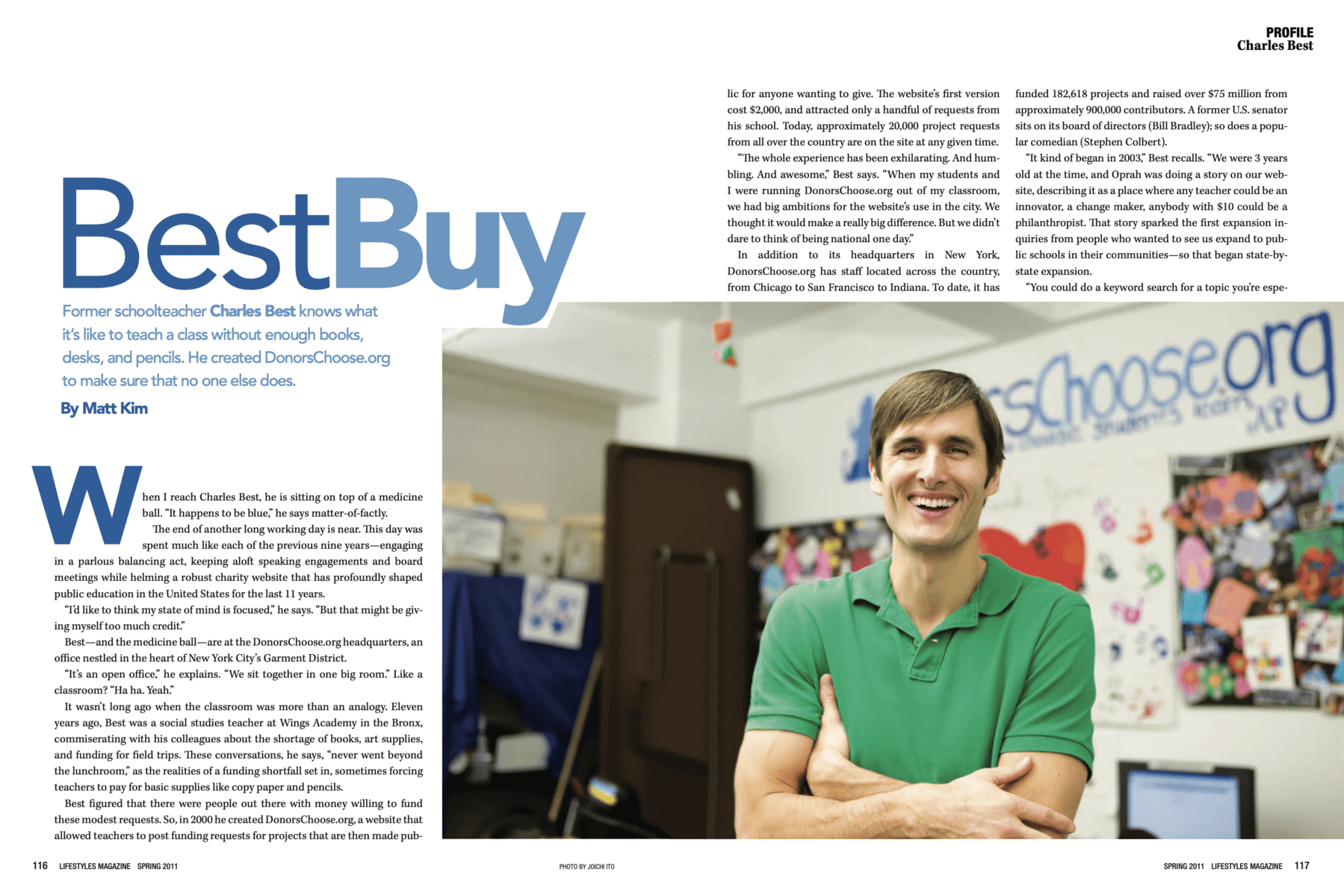Charles Best Former schoolteacher Charles Best knows what it’s like to teach a class without enough books, desks, and pencils. He created DonorsChoose.org to make sure that no one else does. Click on the image to read more Matt Kim Author at Lifestyles Magazine